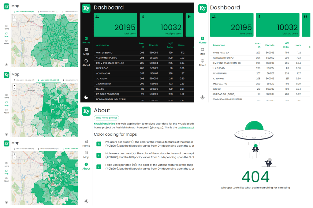 Solution: I built an app over two weekends, which had a basic dashboard on the home page which showed important details such as total users, total pro users and male-to-female user ratio in the cards & it had an area-by-area breakdown of multiple parameters stored in a table. The maps screen has three tabs, the first tab shows the % of pro users in an area, the second tab shows the % of male users in an area & the last tab shows the % of female users in an area. Finally, the about page contained basic instructions about the app. This app also comes with a dark mode toggle button.