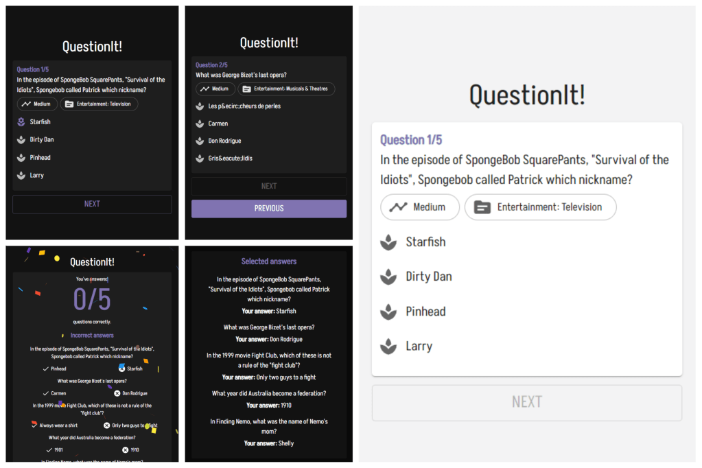 Implemented using: CRA setup, MUI, Open Trivia DB API, Context API