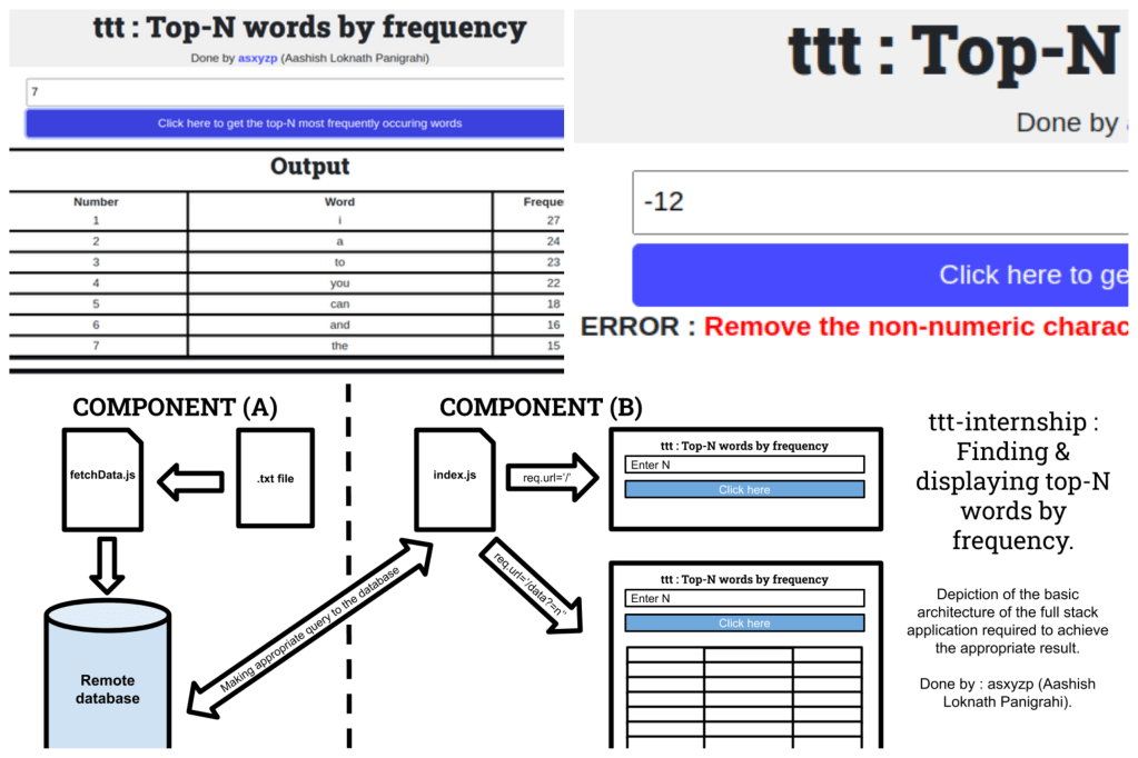 Problem statement: Building a full stack application, which has a front end which accepts a number input N with a submit button. On entering a value and pressing the submit button, a request should be sent to the backend which returns the top N most frequently occurring words in the file (http://terriblytinytales.com/test.txt) & the result is displayed in the frontend, in a tabular format.